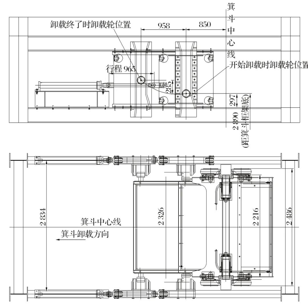 (2)這種2個卸礦點應用在同一箕斗的卸礦方式在我國尚屬首次,會澤礦3號豎井是目前唯一在用的雙卸載點礦井。一般的礦井一個井筒采用一個卸礦點,多個水平的多點卸礦一般要打多個井筒。為了多點卸礦功能的順利實現,移動直軌到位精度偏差不能超過±5 mm,并且應滿足鋼絲繩正常的彈性變形伸縮量的卸載要求。多點卸礦為礦山開采節(jié)約了大量成本,移動直軌卸載裝置如圖2所示。